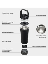 El interior está estampado con líneas de medición e incluye un colador extraíble. El recipiente de almacenamiento en la base y el asa suave y de fácil agarre son ideales para llevar. Con su tapa Tritan a prueba de fugas, está lista para llevarla en el bolso.
