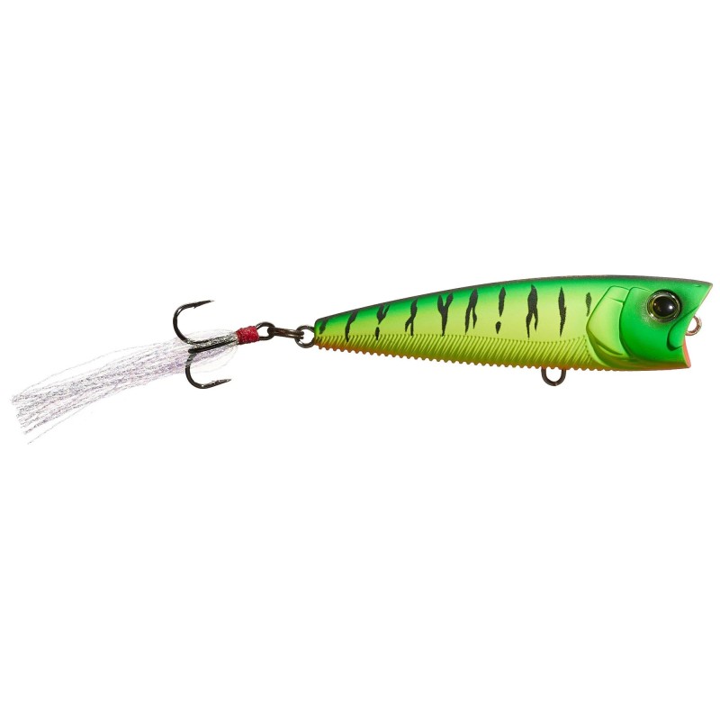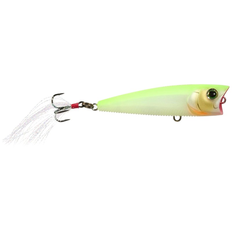 Esta perfectamente equilibrado, con un gancho de cola pulsante hecho de Mylar, es más duradero que las plumas de pollo. También tiene una técnica de doble acción: "Pop & Stop" tradicional o "Walk the Dog". El cuerpo redondo y boyante del popper se asienta horizontalmente para una mejor presentación y fácil orientación.